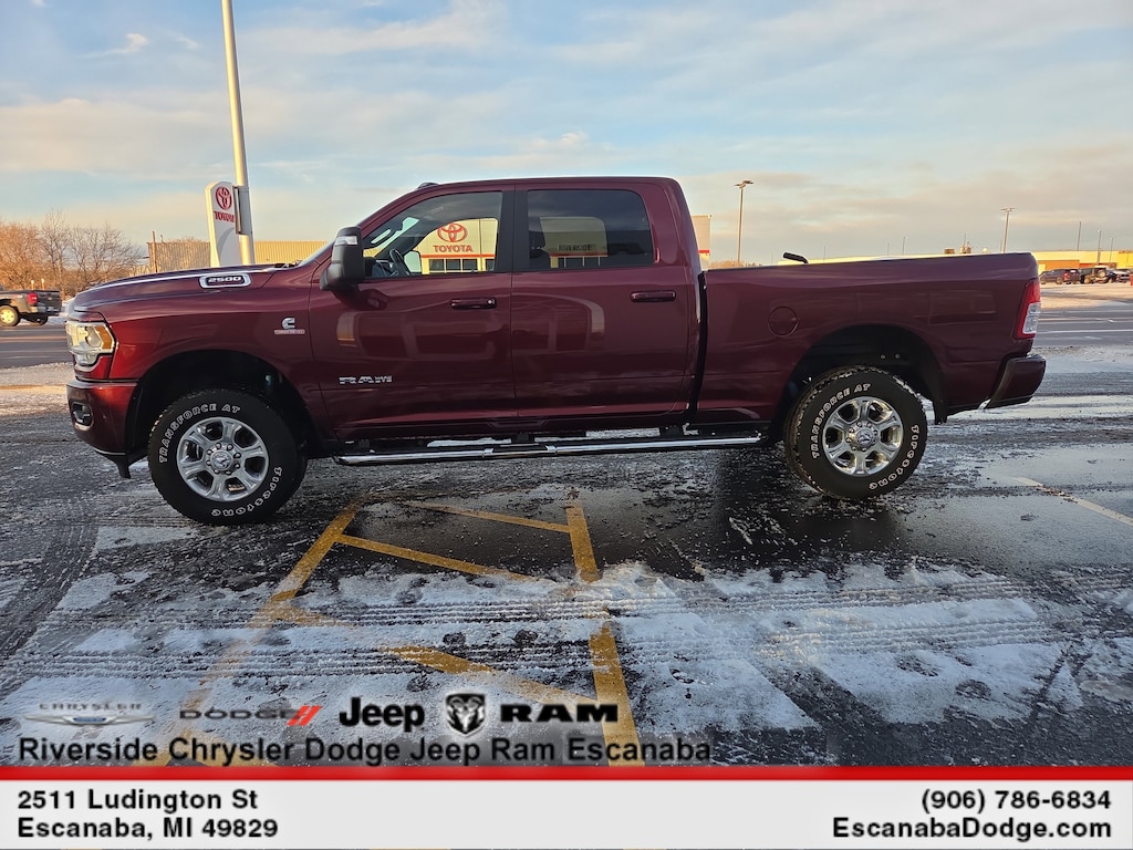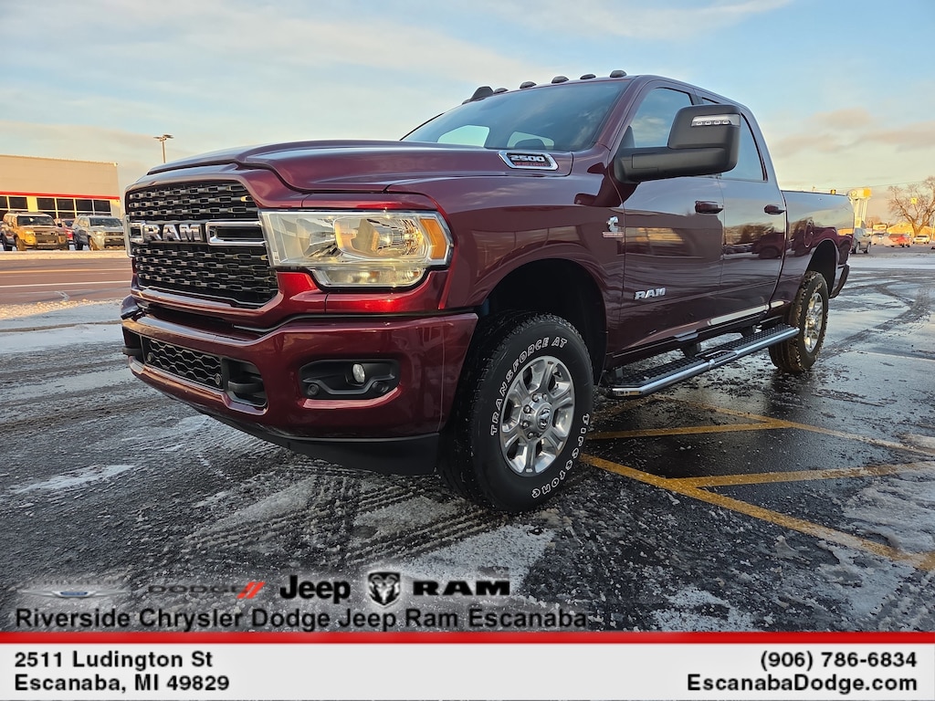 ENGINE: 6.7L I6 CUMMINS TURBO DIESEL Selective Catalytic Reduction (Urea), Dual 730 Amp Maintenance Free Batteries, Cummins Turbo Diesel Badge, Heavy Duty Engine Cooling, Tow Hooks, Diesel Exhaust Brake, Supplemental Heater, Front Bumper Sight Shields, Capless Fuel Fill w/o Discriminator, LEVEL 1 EQUIPMENT GROUP Google Android Auto®, For Details, Visit DriveUconnect.com, For More Info, Call 800-643-2112, Leather Wrapped Steering Wheel, Rear Dome w/On/Off Switch Lamp, Front Fog Lamps, Glove Box Lamp, Auto Power-Folding Mirrors, Footwell Courtesy Lamp, 4G LTE Wi-Fi Hot Spot, Mirror Running Lights, Radio: Uconnect 5 W w/8.4 Display, 8.4 Touchscreen Display, Foam Bottle Insert (Door Trim Panel), Apple CarPlay®, Big Horn IP Badge, Power Adjustable Convex Aux Mirrors, Forward & Reverse Utility Lights, Locking Lower Glove Box, Selectable Tire Fill Alert, SiriusXM Satellite Radio, Power Heated Fold Telescope Mirrors, Exterior Mirrors w/Supplemental Signals, Steering Wheel Mounted Audio Controls, Exterior Mirrors Courtesy Lamps, Dual Glove Boxes, 2nd Row In Floor Storage Bins, Power, RADIO: UCONNECT 5 NAV W/8.4 DISPLAY Google Android Auto®, For Details, Visit DriveUconnect.com, For More Info, Call 800-643-2112, GPS Navigation, 4G LTE Wi-Fi Hot Spot, SiriusXM w/360L, Connected Travel & Traffic Services, All R1 High Radios, 8.4 Touchscreen Display, Alexa Built-In, Apple CarPlay®, Off-Road Information Pages, Selectable Tire Fill Alert, Trailer Tow Pages, Disassociated Touchscreen Display, HD Radio, Air Conditioning ATC w/Dual Zone Control, All Radio Equipped Vehicles, CHROME FLAT WHEEL-TO-WHEEL SIDE STEPS, ANTI-SPIN DIFFERENTIAL REAR AXLE, HEATED SEATS & WHEEL GROUP Heated Steering Wheel, Steering Wheel Mounted Audio Controls, Heated Front Seats, Leather Wrapped Steering Wheel, BLACK, PREMIUM CLOTH BUCKET SEATS Bucket Seats, Manual Adjust 4-Way Front Passenger Seat, Power Adjust 8-Way Driver Seat, Rear 60/40 Folding Seat, Front Seat Back Map Pockets, Power 2-Way Driver Lumbar Adjust, Full Length Upgraded Floor Console, REMOTE START SYSTEM, TRANSMISSION: 6-SPEED AUTOMATIC (68RFE). Ram Big Horn with Delmonico Red Pearlcoat exterior and Black interior features a Straight 6 Cylinder Engine with 370 HP at 2800 RPM*.